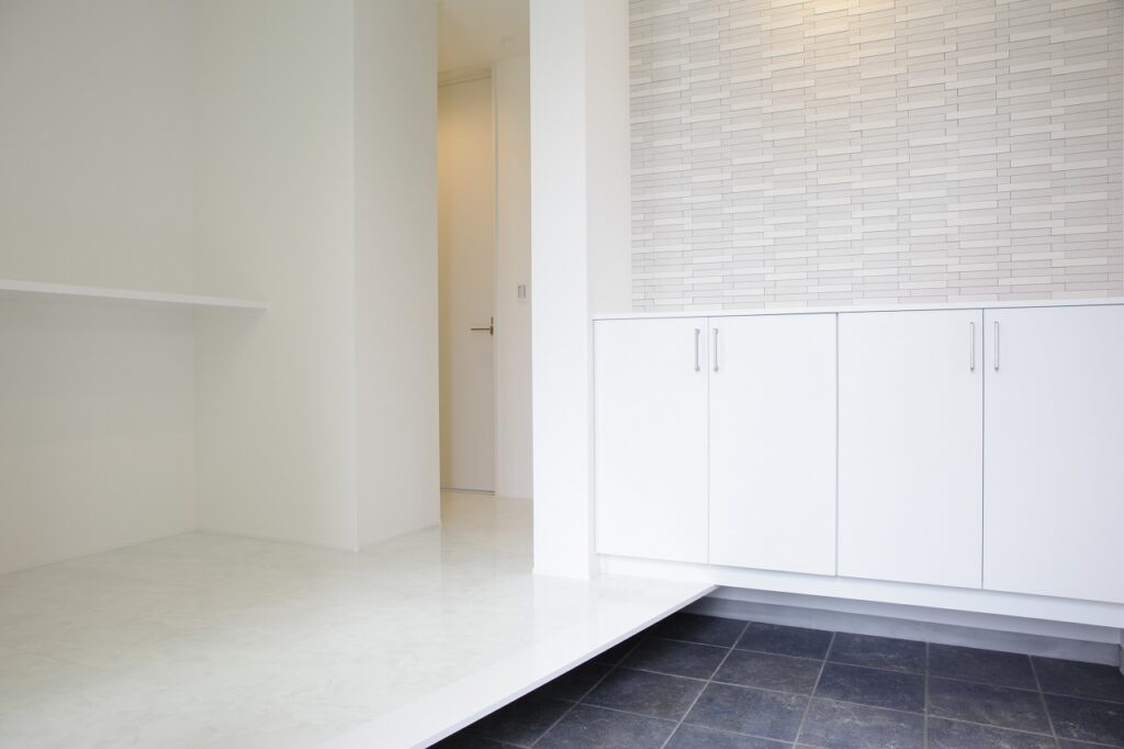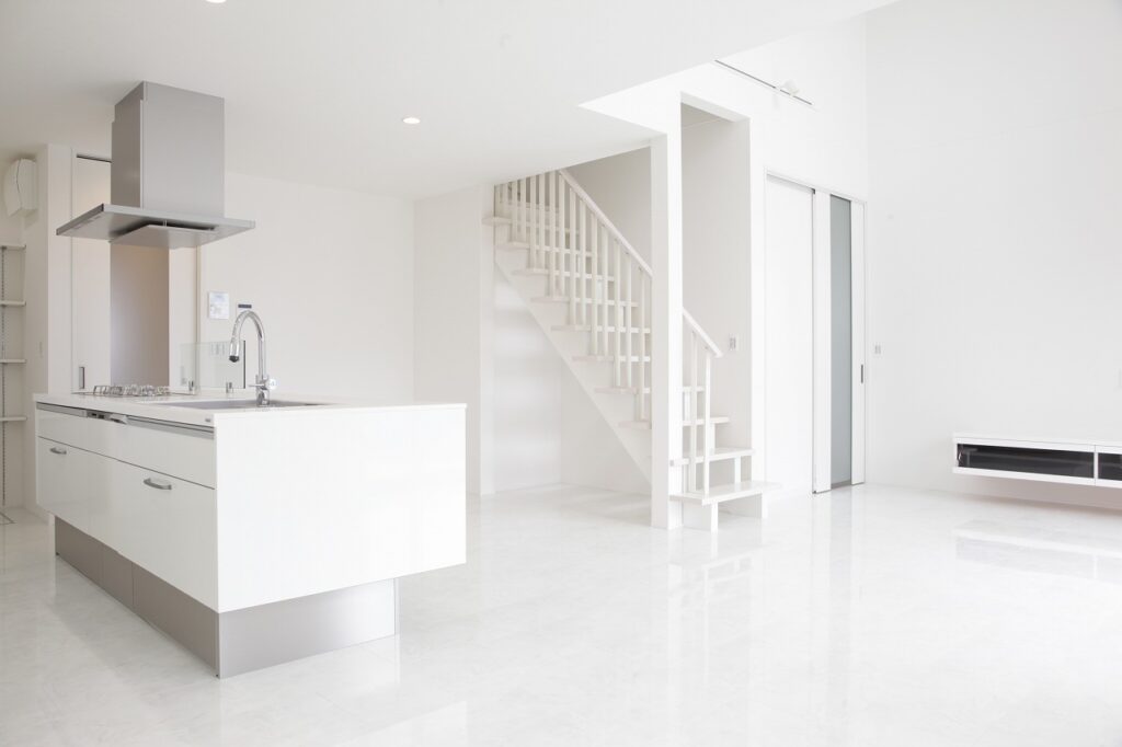 清潔感の溢れる空間にしたいというお施主様のご要望で、白の石目調フロアを用い、シンプルモダンにコーディネートしました。