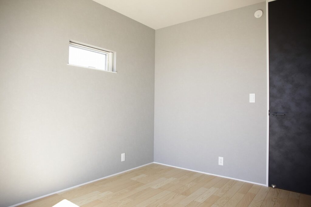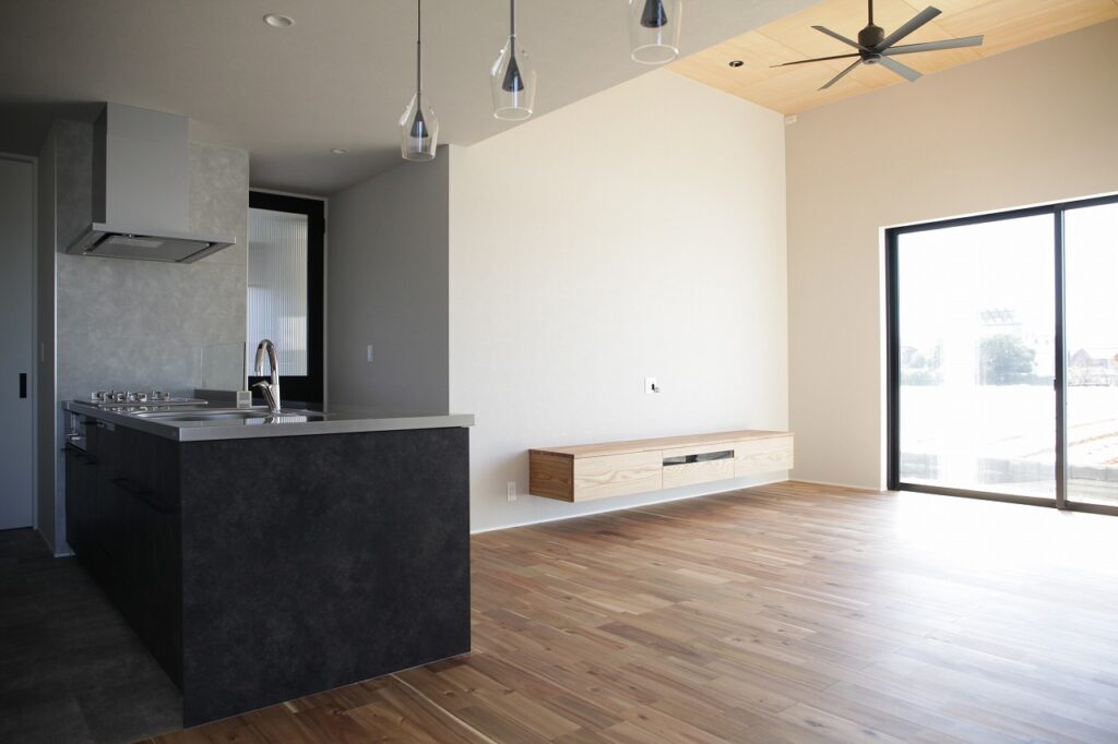 室内は、アカシアの無垢の床にライトグレーのクロスを組み合わせ、アクセントに黒を取り入れて軽めなビンテージ感をプラス。グレーの壁は、当社のモデルハウスの雰囲気からヒントを得たものです。