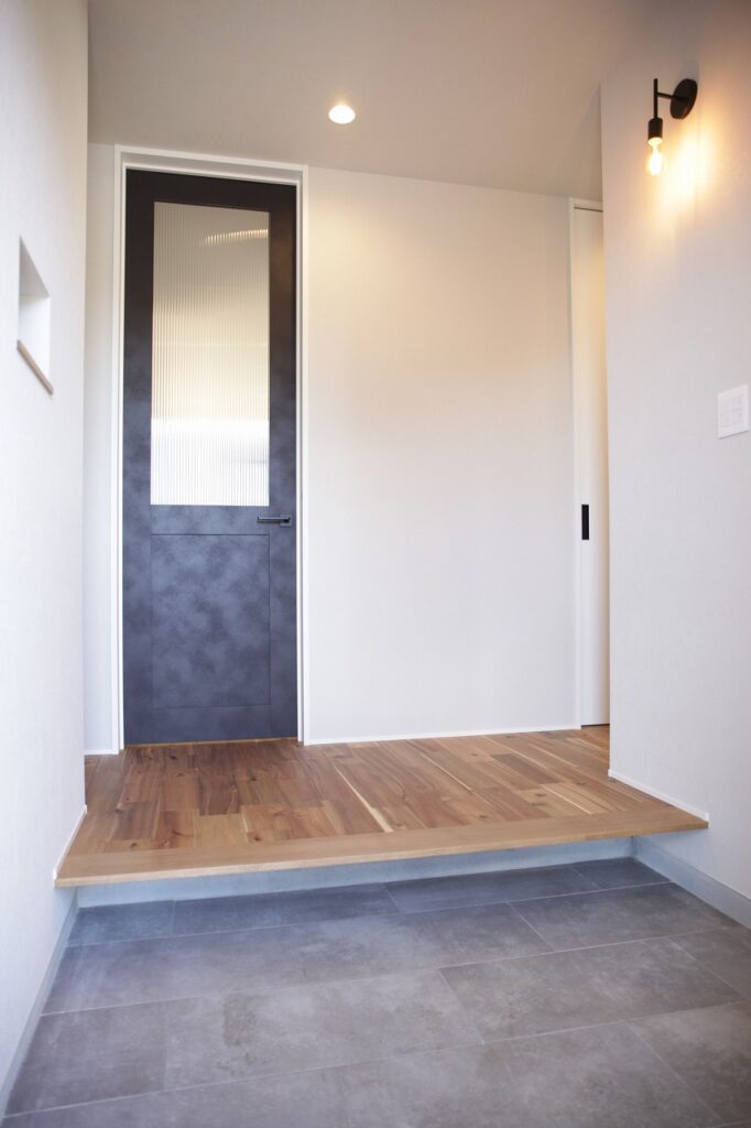 まず、玄関引き戸から室内に入ると、シューズクローク付きの土間が横長に設けてあり、窓にはモールガラスを用いてビンテージ感をプラス。玄関ホールからLDKに入るとすぐダイニングキッチンがあり、ホールからダイニングキッチンへの出入り口を2か所設けて回遊動線を確保。買い物帰りの際にはキッチン側から入って荷物をすぐにしまうことができます。