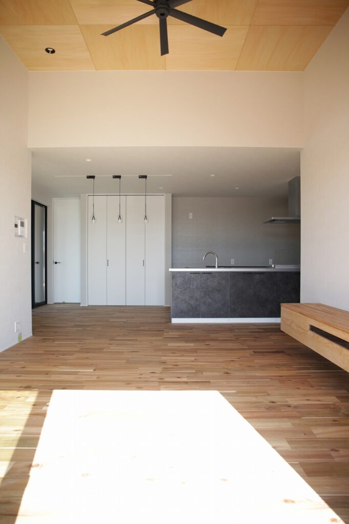 間取りは、LDKを中心に、水回りを北側一列に並べて配置。リビングの両脇に主寝室と子ども部屋2室を振り分け、非常に暮らしやすい間取りとなっています。しかも、LDKは天井高が最高で350cmあり、視界が縦横に広がって開放感が絶大。ファンも黒をセレクトし、ライトビンテージな空間をいっそうスタイリッシュに引き立てます。