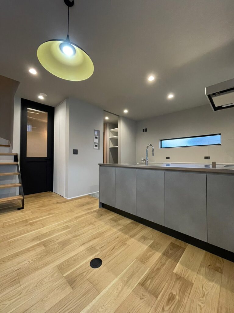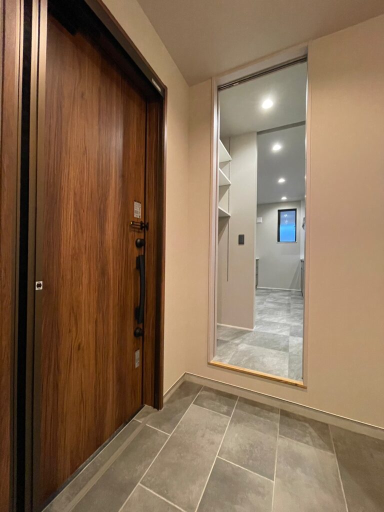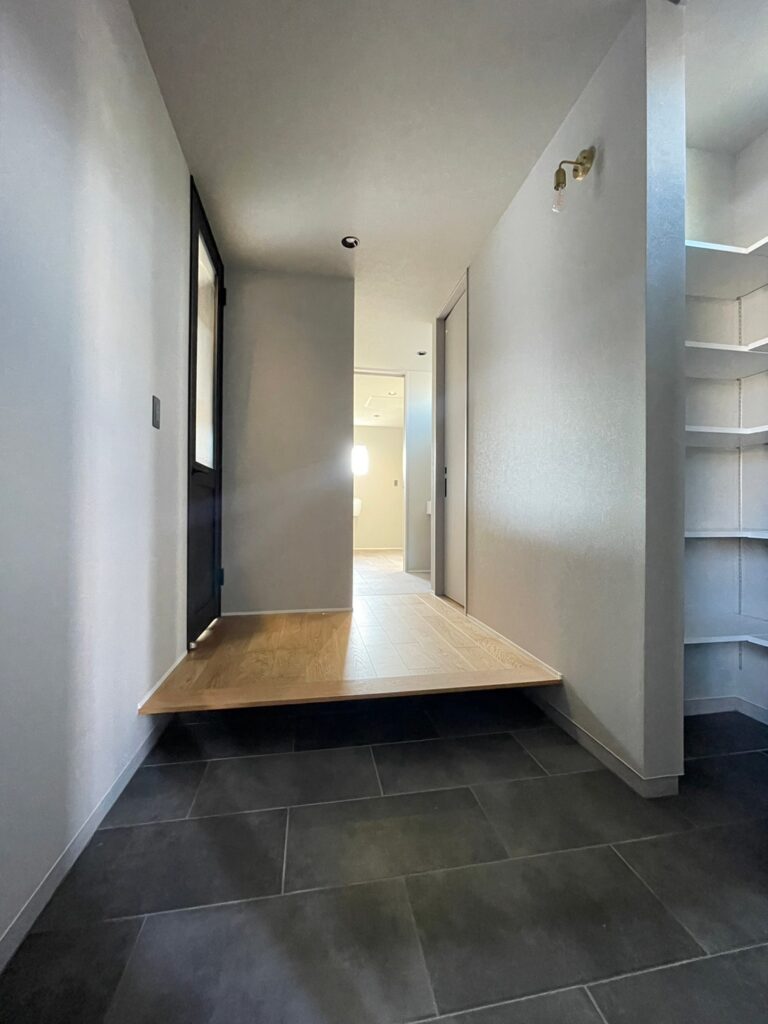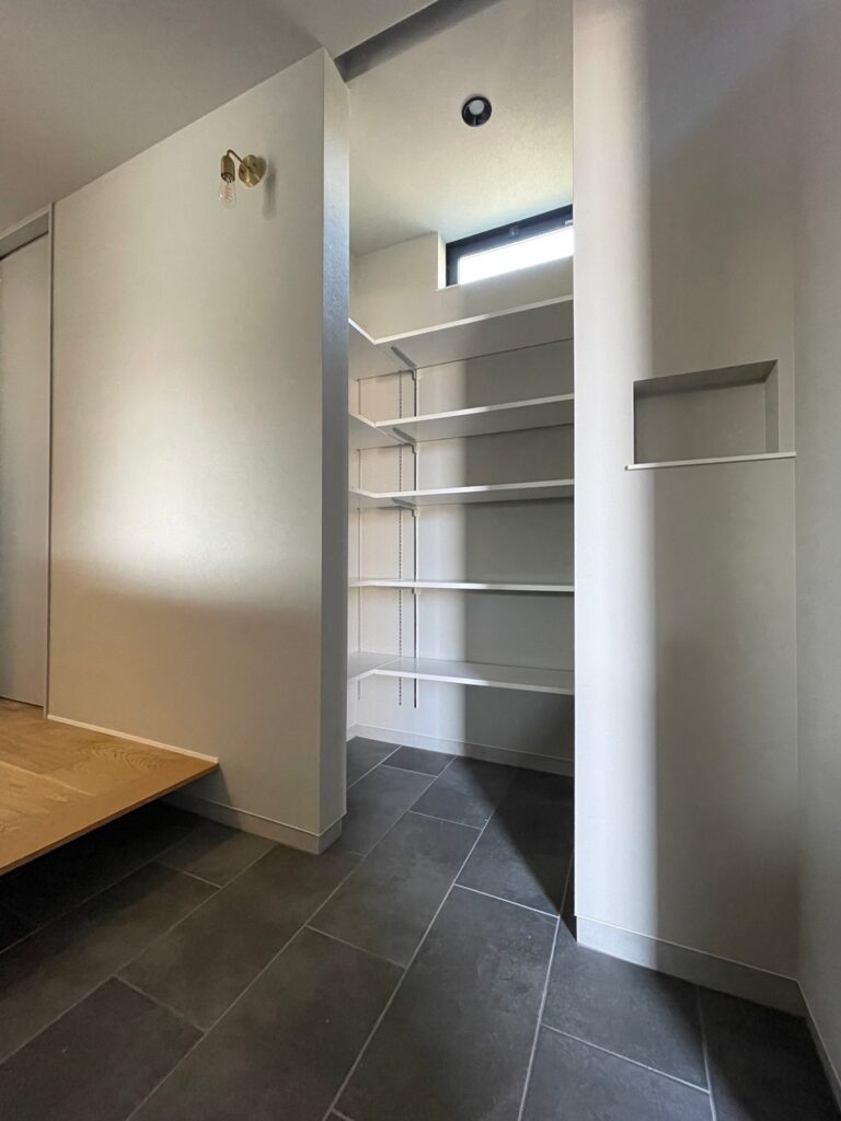 玄関土間から直にパントリーに上がり、そのままキッチンへ通り抜けできる動線を確保。買い物帰りに荷物をパントリーにすぐしまえます。