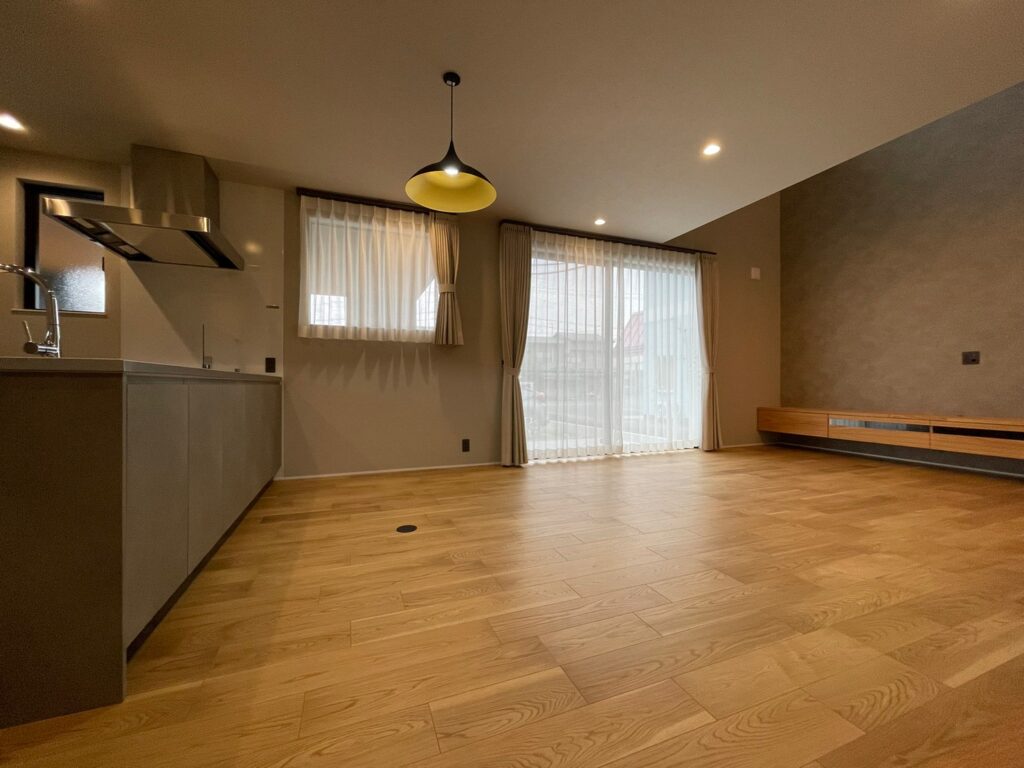 LDKは20畳の広さで、しかも吹き抜けスペースを設けてあるため、開放感が抜群。室内はライトグレーのクロスとオークのフローリングでコーディネートし、シンプルでスタイリッシュな空間に仕上がりました。キッチンからはリビングダイニングとタイルデッキの庭まで見渡せます。